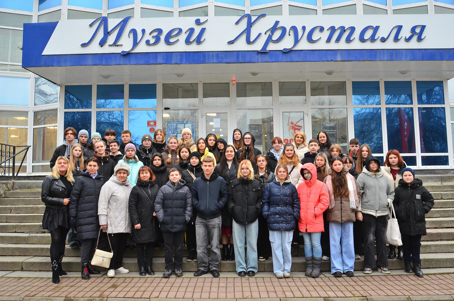 Совместная группа учащихся и педагогов 11 и 14 брянских школ с организатором автобусной экскурсии в районный центр Брянской области город Дятьково, руководителем проекта «Юношеству – окрыляющий пример» Тамарой Михайловной Гречишниковой перед входом в здание «Музея дятьковского хрусталя», 6 декабря 2025 года