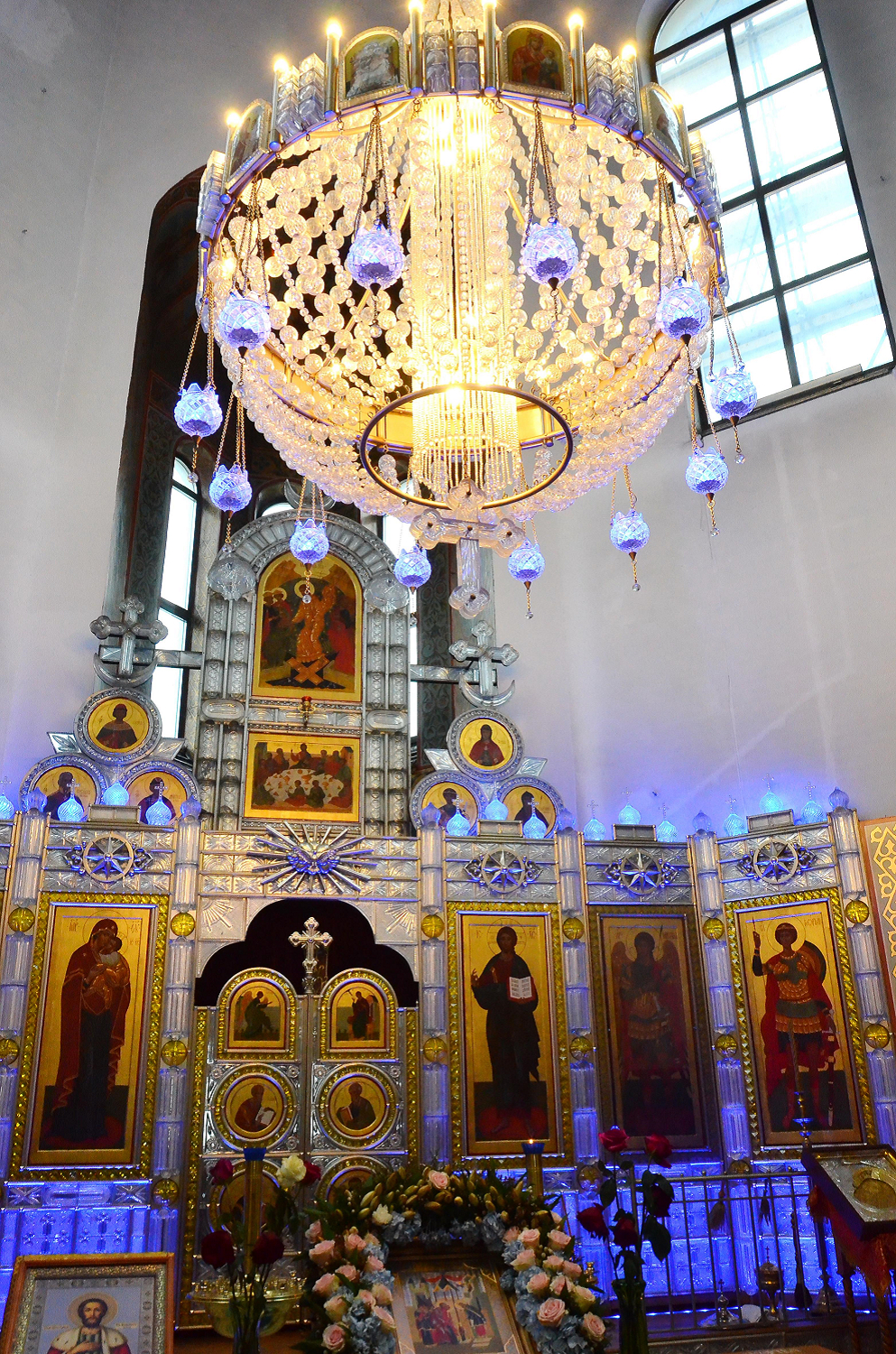 Вид на хрустальный иконостас и паникадило Храма в честь иконы Божией Матери «Неопалимая Купина»; город Дятьково, 6 декабря 2025 года
