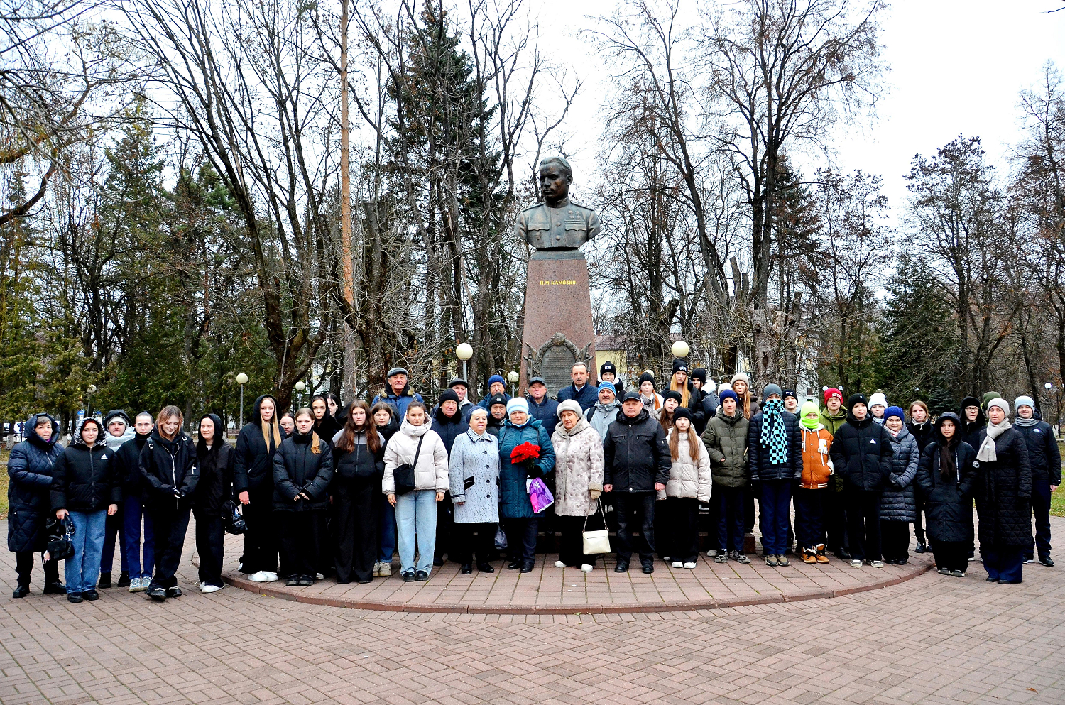 Памятный снимок участников митинга в честь Героев Отечества у бронзового бюста дважды Героя Советского Союза Павла Михайловича Камозина в именном Камозинском сквере города Брянска 9 декабря 2025 года