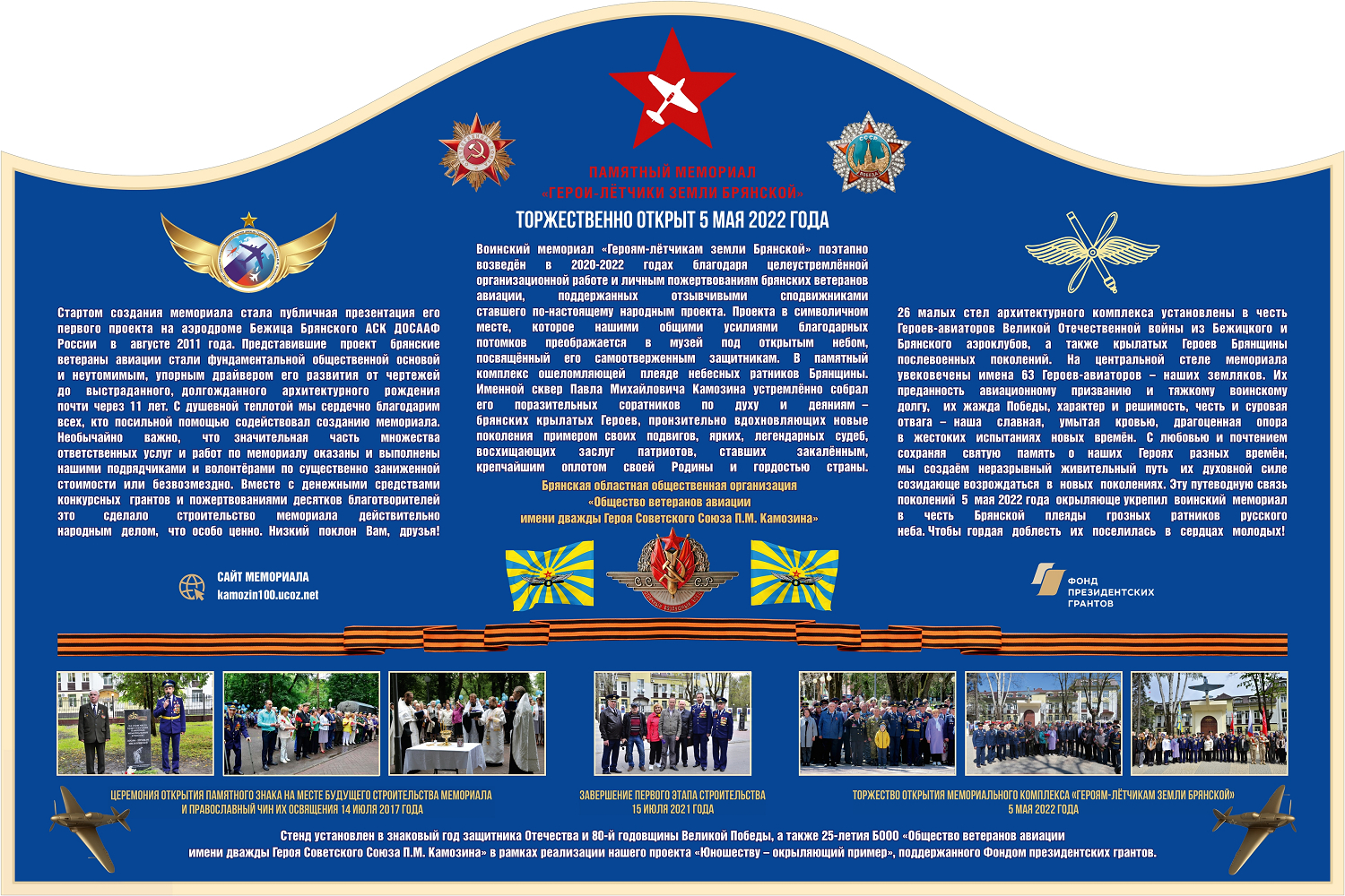 5-го декабря 2025 года ООО «ВИП Строй Дизайн» в брянском сквере «имени Павла Михайловича Камозина» на малой площадке слева от мемориала «Героям-лётчикам земли Брянской» установлен уличный стенд, представляющий историю его строительства и общественное объединение его создателей. Структура холста стенда по форме и содержанию имитирует фигурную страницу развёрнутого буклета, выполняя функцию специальной информативной стелы – аналогично информативной стеле у Монумента боевой славы лётчикам – защитникам Родины на Красноармейской улице. И так же, как там, специальный стенд установлен слева от мемориального комплекса. Такое единство глубоко символично.