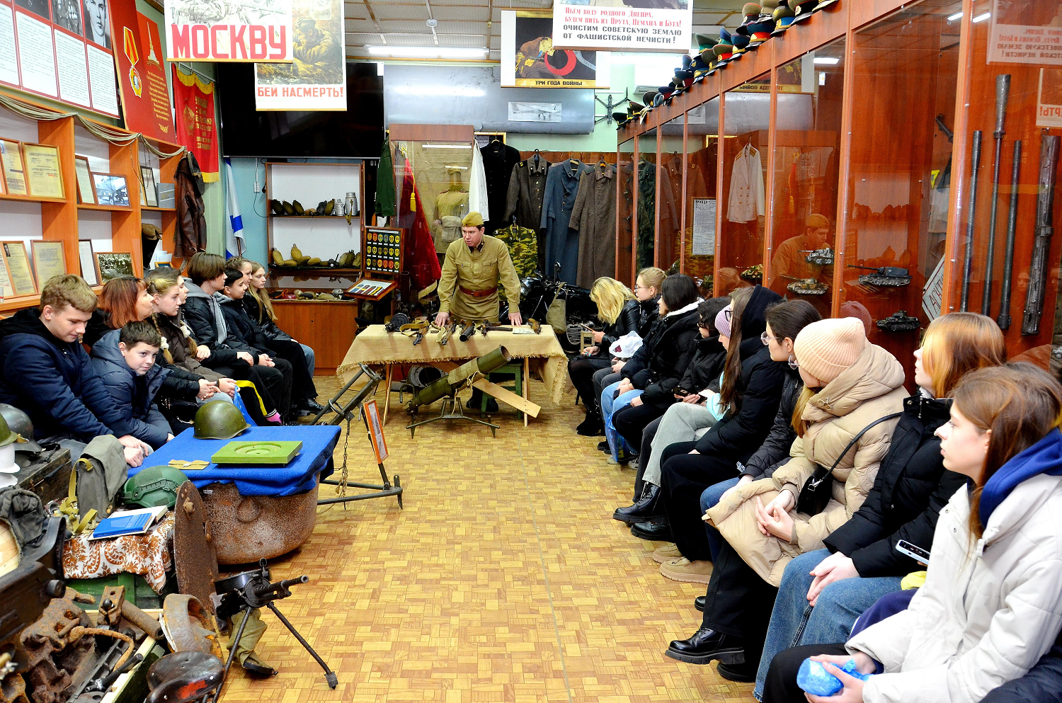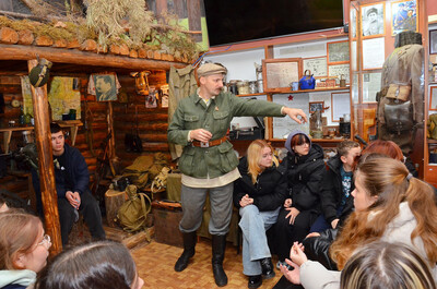 Научный сотрудник МБУК «Историко-краеведческий музей» Дятьковского района Брянской области Николай Михайловича Шемякин во втором выставочном зале музея проводит лекционную экскурсию о партизанской борьбе на Брянщине для организованной группы учащихся из 11 и 14 брянских школ. Город Дятьково, 6 декабря 2025 года